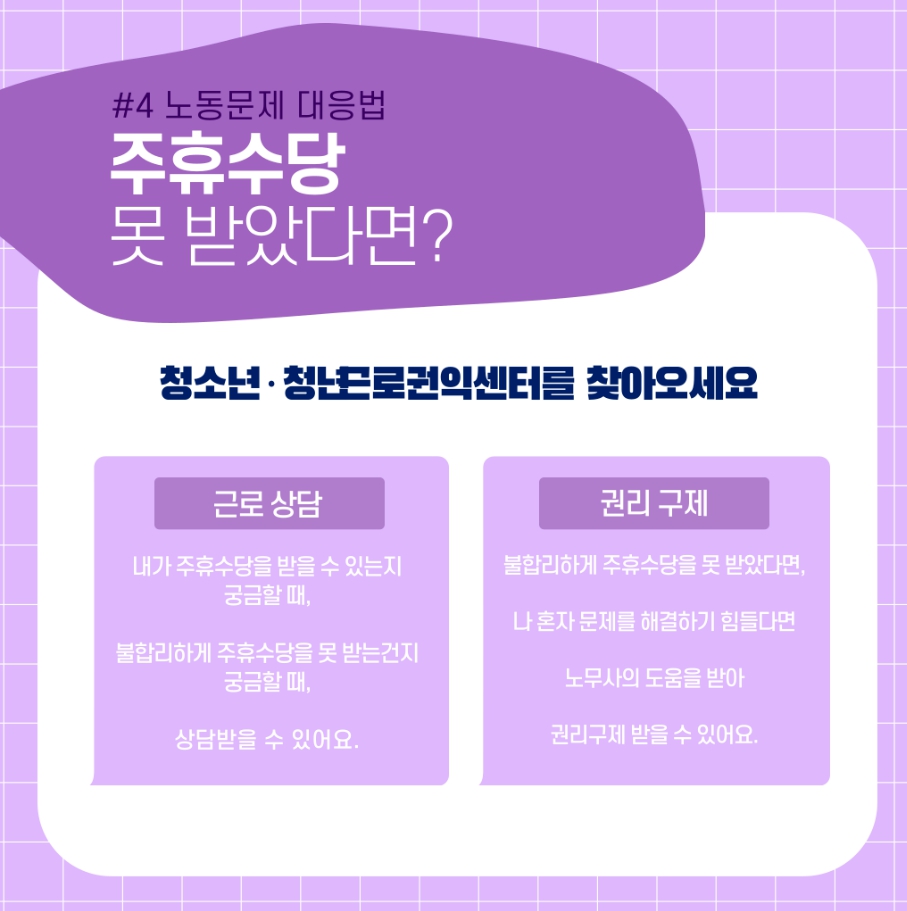 주휴수당 관련해서 불합리한 문제가 생겼을 때, 청소년근로권익센터에서도 도움을 받을 수 있습니다.