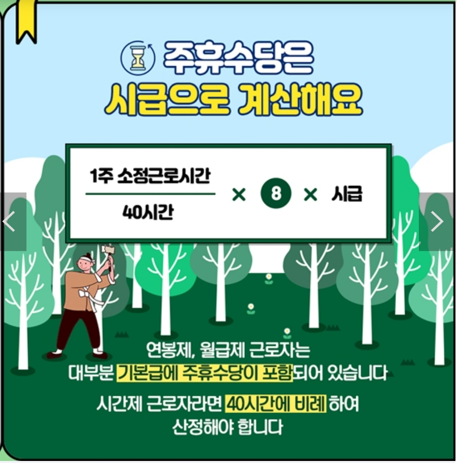 - 주휴수당 = (주간 근로시간 ÷ 법정근로시간) × 8시간 x 시급