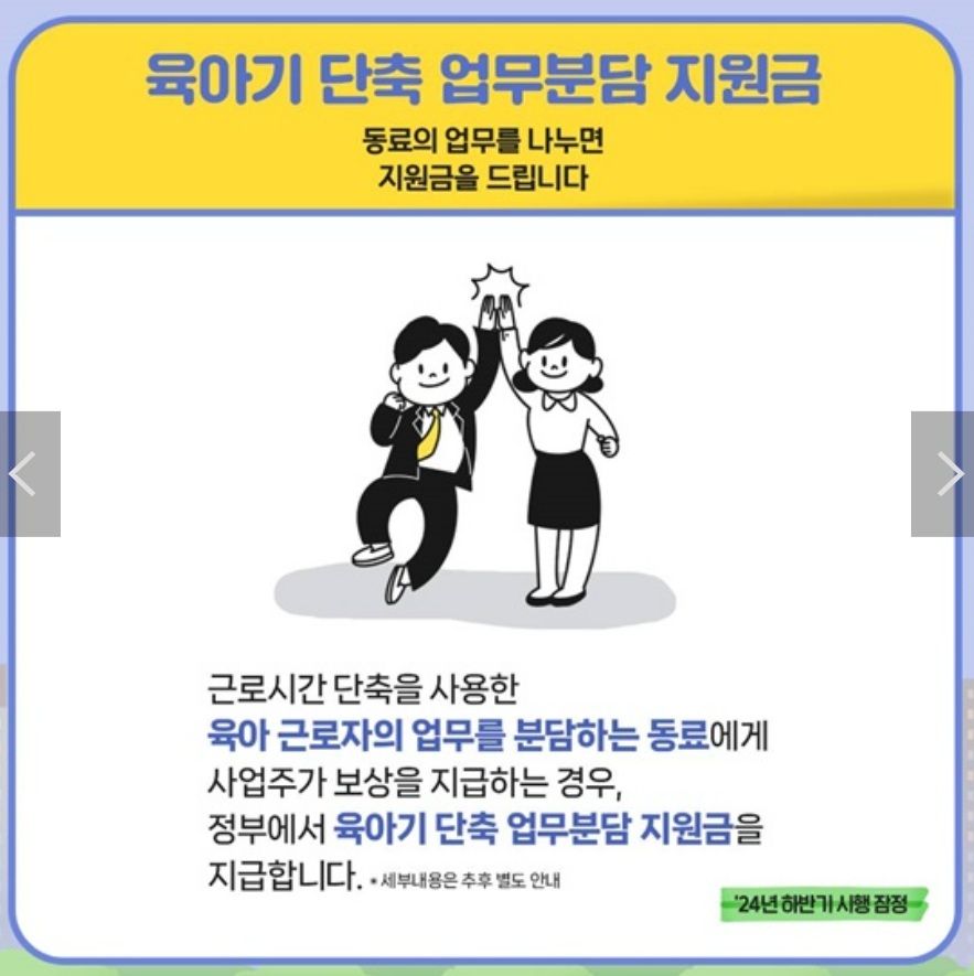 2025년부터는 동료업무 분담 지원금이 신설됩니다. 육아휴직을 사용하는 직원의 업무를 동료가 대신하게 될 경우, 그 동료에게 월 20만 원의 지원금이 지급됩니다.