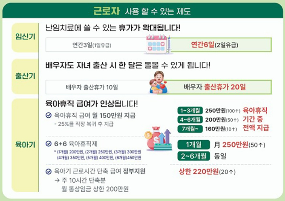 배우자의 유급 출산휴가가 기존 10일에서 20일로 확대됩니다. 이는 부부가 함께 자녀 양육에 참여할 수 있도록 지원하는 정책으로, 맞벌이 가정에서 더 큰 혜택을 누릴 수 있게 되었습니다.