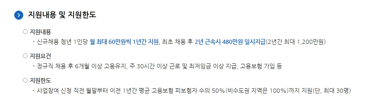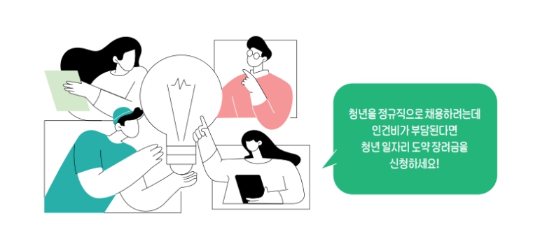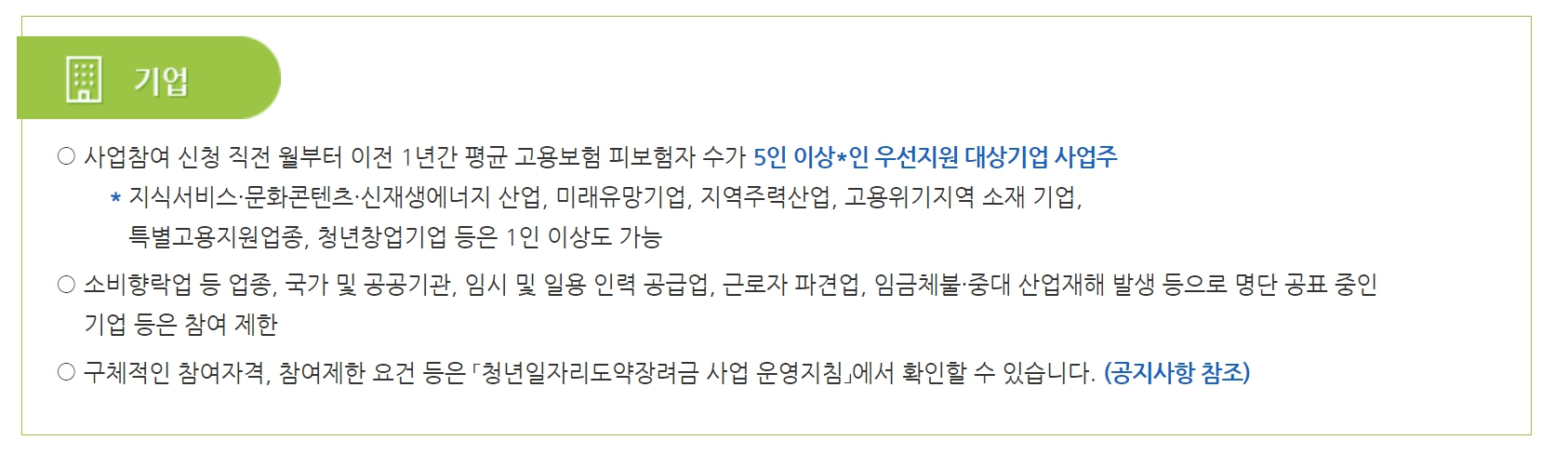 - 기업 : 5인이 넘는 우선지원대상기업으로서, 청년을 정규직으로 신규 채용하고 6개월 이상 고용 유지하는 기업