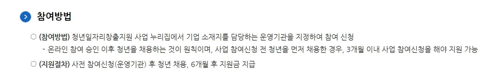 기업은 먼저 청년일자리창출지원 사업 누리집에서 사업 참여 신청을 해야 하며, 온라인으로 승인을 받은 후 청년을 채용할 수 있습니다.