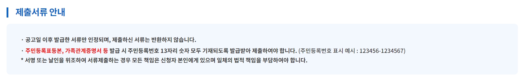 특히 모든 서류는 공고일 이후 발급된 것이어야 하며, 주민등록번호 13자리를 모두 기재해야 하는 등의 세부 조건이 있으니 유의해야 합니다.