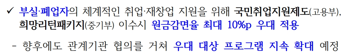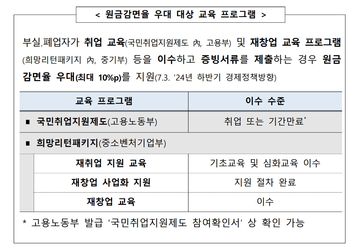 특히 부실이나 폐업으로 어려움을 겪는 자영업자는 재창업 프로그램이나 취업 교육을 이수하면 원금 감면율 10%의 추가 혜택을 받을 수 있습니다.