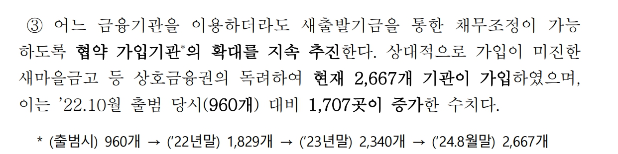 이는 더 많은 금융기관이 새출발기금과 협력함으로써, 자영업자들이 다양한 금융기관의 부채 채무 조정 대상에 포함시킬 수 있게 된 것입니다.