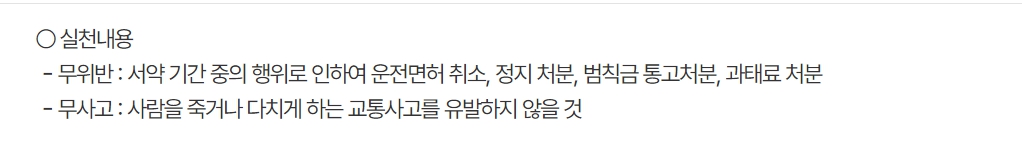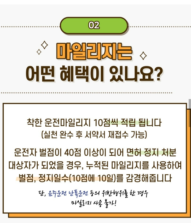 서약 후 1년 동안 교통법규를 위반하지 않거나 교통사고를 일으키지 않으면 마일리지가 적립됩니다. 만약 위반 사항이 발생할 경우 해당 연도의 마일리지는 적립되지 않고, 서약이 자동 종료됩니다.