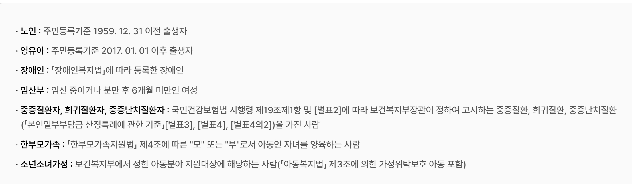 1. 기초생활수급자: 생계급여 또는 의료급여를 받는 가구가 주요 대상입니다.