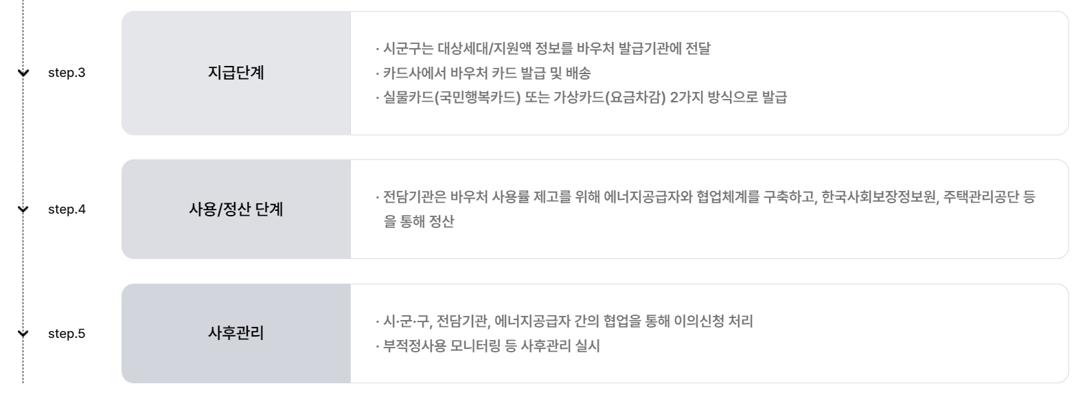 에너지 바우처는 실물 카드 또는 계좌 이체 방식으로 지급됩니다.