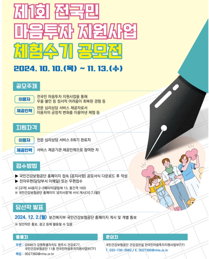 또한, 이용자 및 상담 제공자를 대상으로 체험수기 공모전도 개최됩니다. 상담을 통해 정서적 회복을 경험한 이용자나 상담의 중요성을 체감한 제공자의 긍정적인 경험을 공유할 수 있는 기회를 제공합니다. 체험수기 공모는 2024년 10월 10일부터 11월 13일까지 접수되며, 우수작품에는 소정의 상금도 수여됩니다.