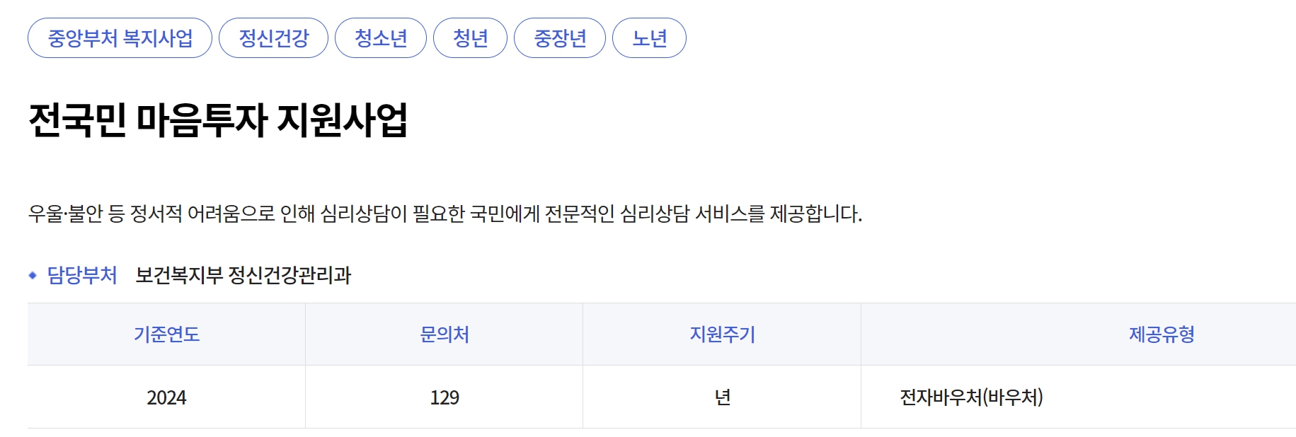 전국민 마음투자 지원사업은 정부가 전국민 대상 심리 상담 지원 프로그램입니다.