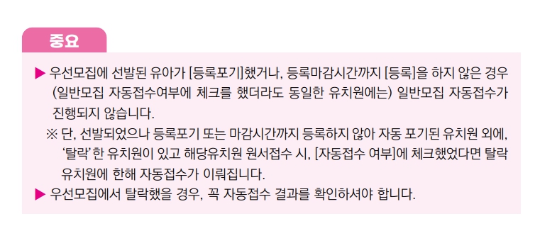 우선 모집에 해당하지 않는 가정의 학부모들은 이후 일반 모집 절차에서 신청할 수 있습니다. 우선 모집의 자격 검증은 포털 내 자격 검증 시스템을 통해 이루어지며, 검증되지 않은 경우 각 기관에 관련 서류를 제출해야 합니다