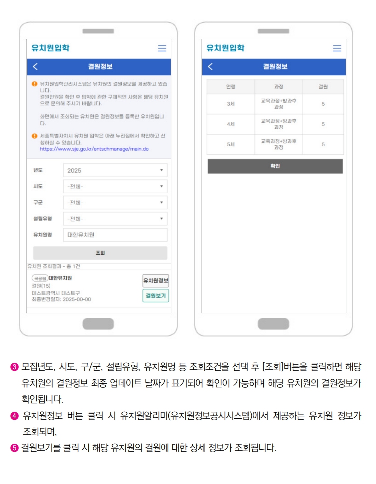 포털 내의 ‘모집 요강 찾기’ 기능을 통해 연령, 지역, 기관 유형에 따른 필터링을 설정해 조건에 맞는 기관을 조회할 수 있습니다. 특히 지도 검색 기능을 통해 거주지와 가까운 어린이집 및 유치원을 선택할 수 있습니다
