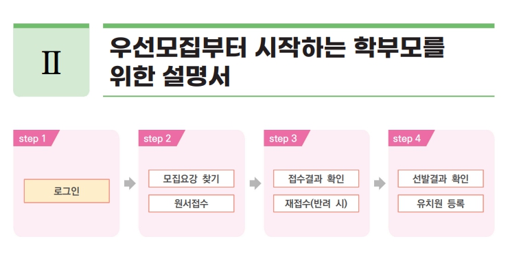 우선 모집은 일정 조건에 부합하는 가정이 먼저 신청할 수 있도록 하며, 이후 일반 모집에서는 신청자 중 대기자와 미선발자를 대상으로 무작위 추첨을 통해 입소 순번을 배정하게 됩니다